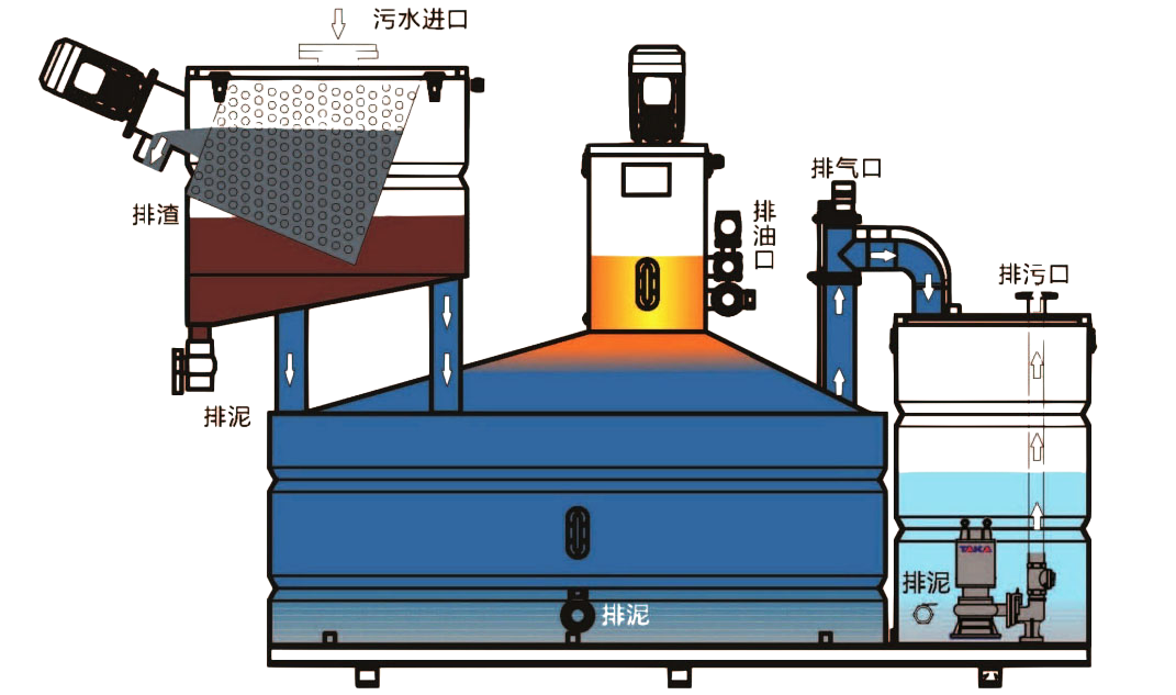 4、顆粒、污泥沉淀功能:利用密度差原理,油浮在上面,顆粒物及污泥沉淀,定期排泥;